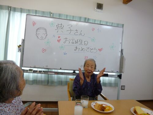 7月は二名の方がお誕生日を迎えられました。 今月はお二方とも、小規模でのお誕生会を希望してくださいました♪ まずはYさまです。 ケーキを焼いて、みんなでお祝いさせて頂きました。 甘いものに目がなくて、おしゃれ好きなYさま。 みんなからのお祝いに素敵…