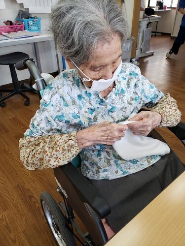 事業所では、手芸部を発足し活動しています。 手作業を通して、達成感や充実感を感じてただけるように部の活動をすすめています。 近くの幼稚園や保育園にプレゼントする雑巾などや 事業所で使用する三角巾も皆さんの手縫いです! 応援旗も手作りです。 奥様…